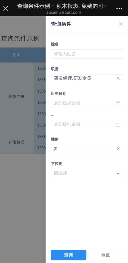 - 条件输入:支持多种查询条件类型(文本、数字、日期等)