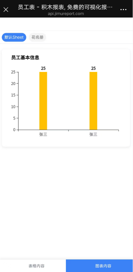 移动端报表与图表采用分开展示的方式,通过点击"表格内容"与"图表内容"标签来切换查看。