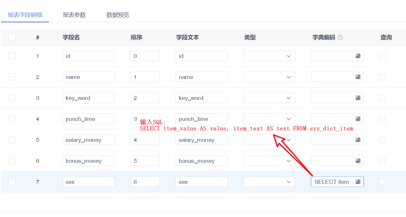 - 在字段属性的「字典 code」中直接填写 SQL;