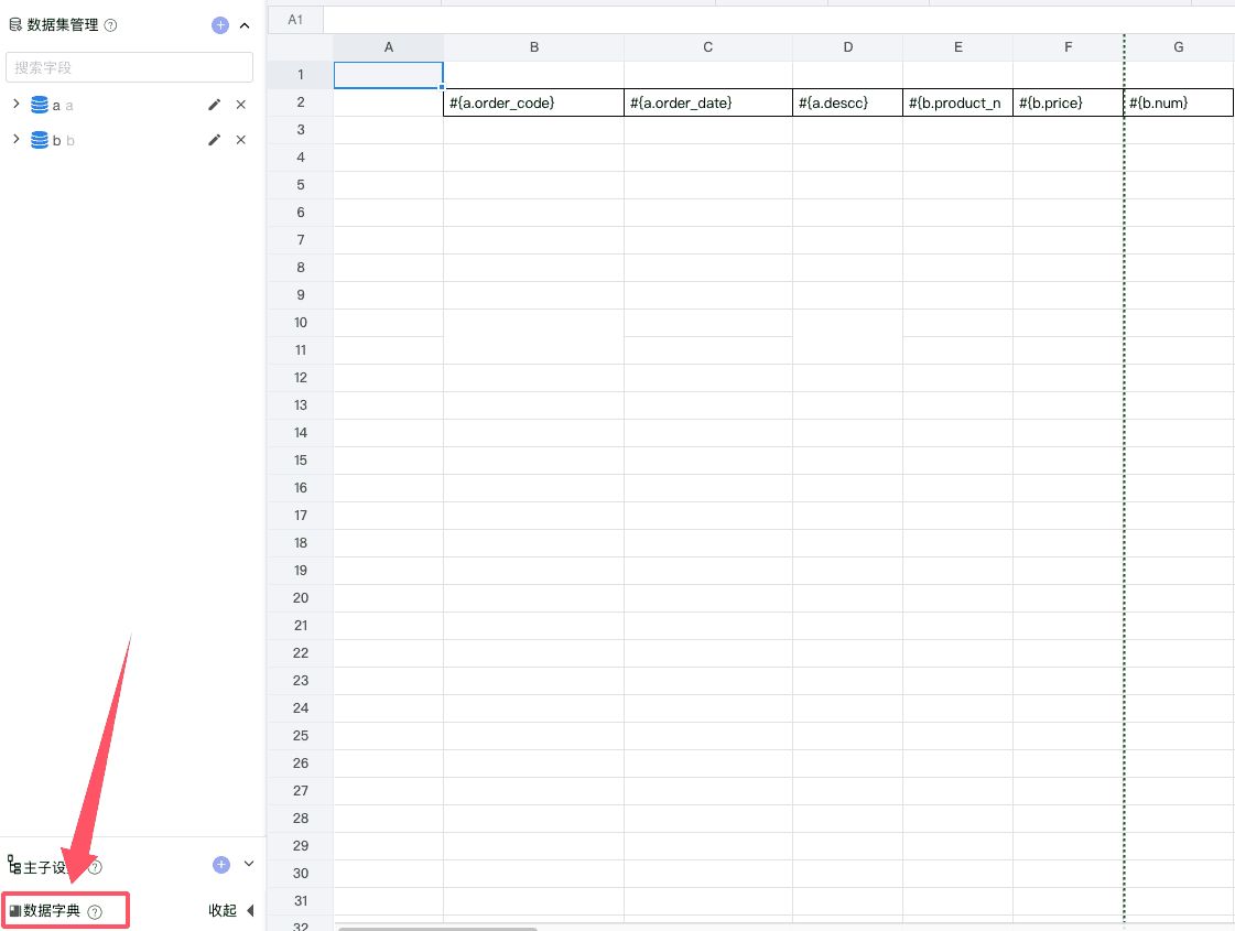 在报表设计页面,点击顶部工具栏的「添加数据字典」按钮,进入数据字典管理界面。