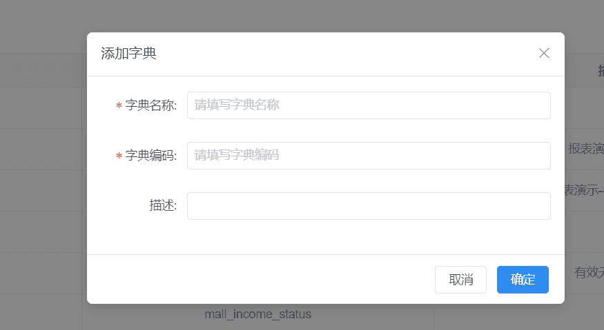 | 字典名称 | 字典的显示名称,支持中英文、数字 | 性别字典、订单状态 |