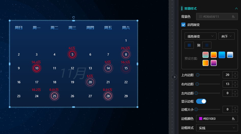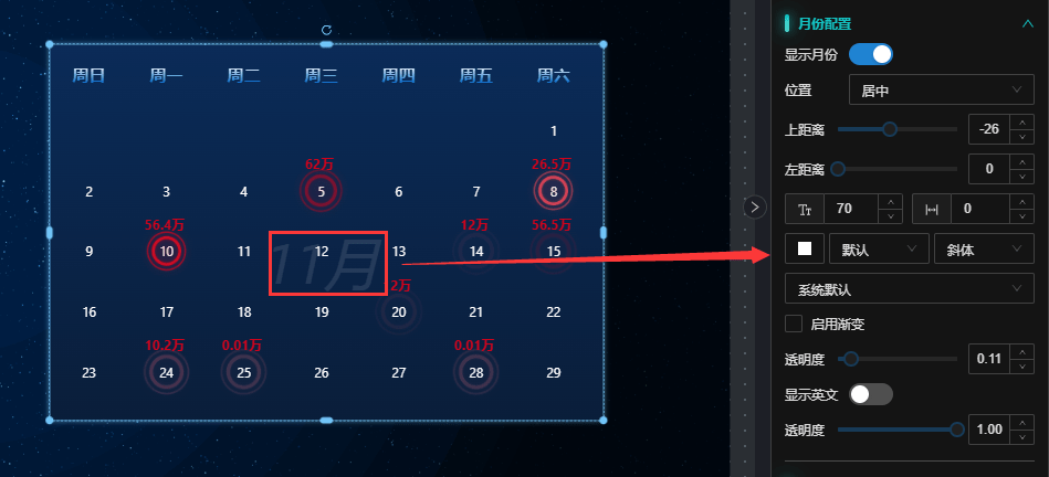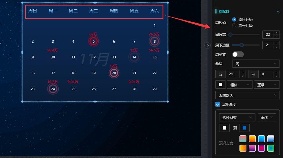 - 背景色:设置日历背景色,与渐变色互斥