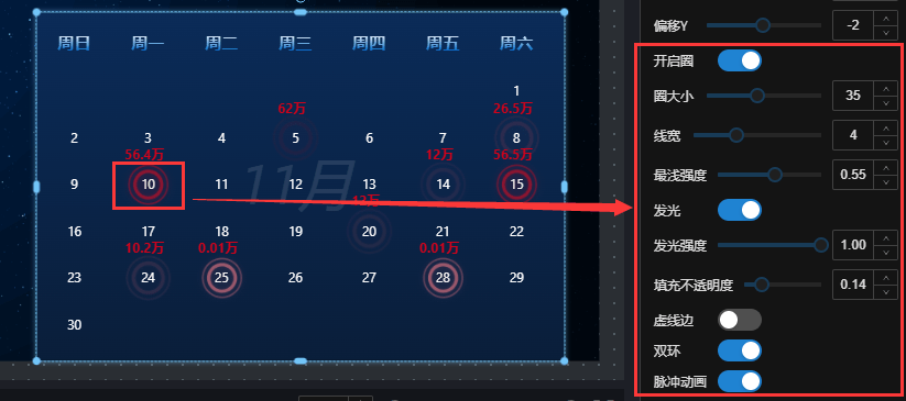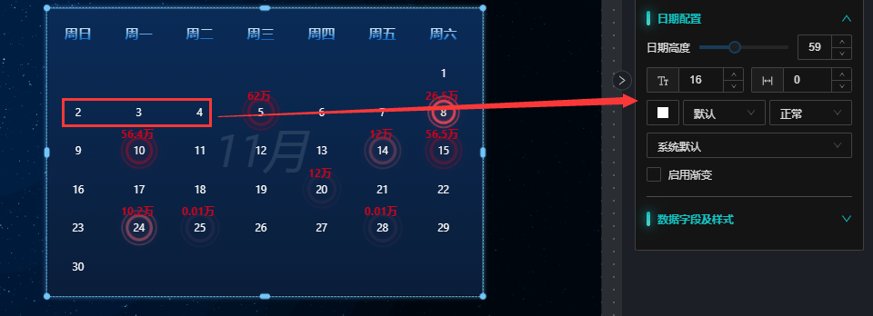 - 日期字段:设置哪个日期展示为有数据样式,如:
