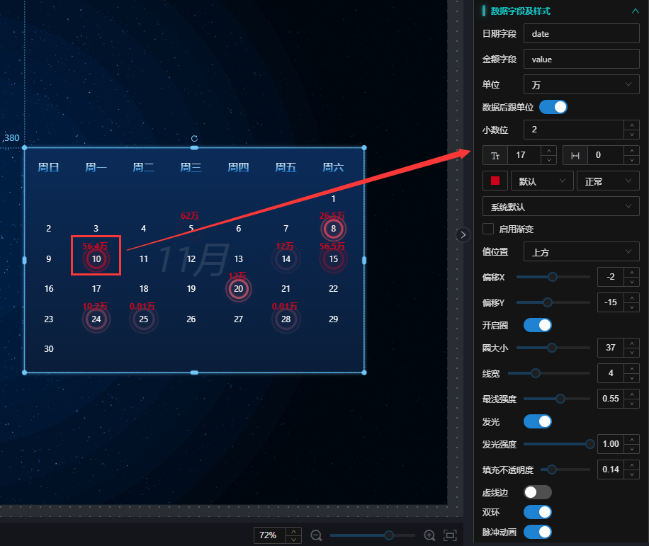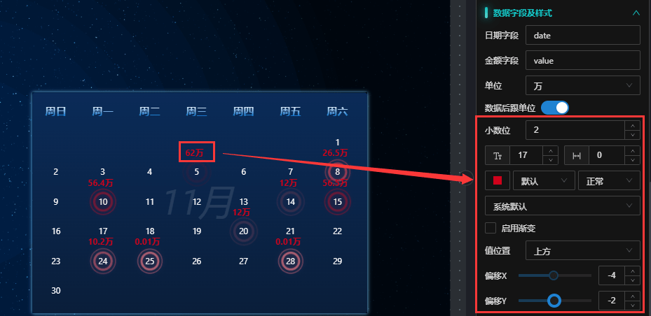 date与 “3.数据格式”中返回的数据字段“date”对应 - 金额字段:在日期上显示金额