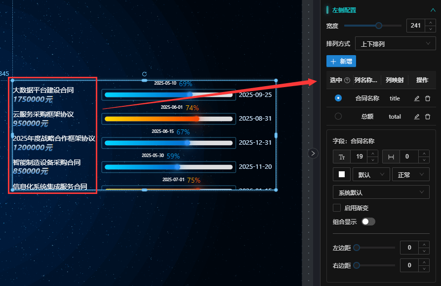 配置数据源字段与组件显示字段的映射关系,将数据中的字段映射到对应的显示位置。