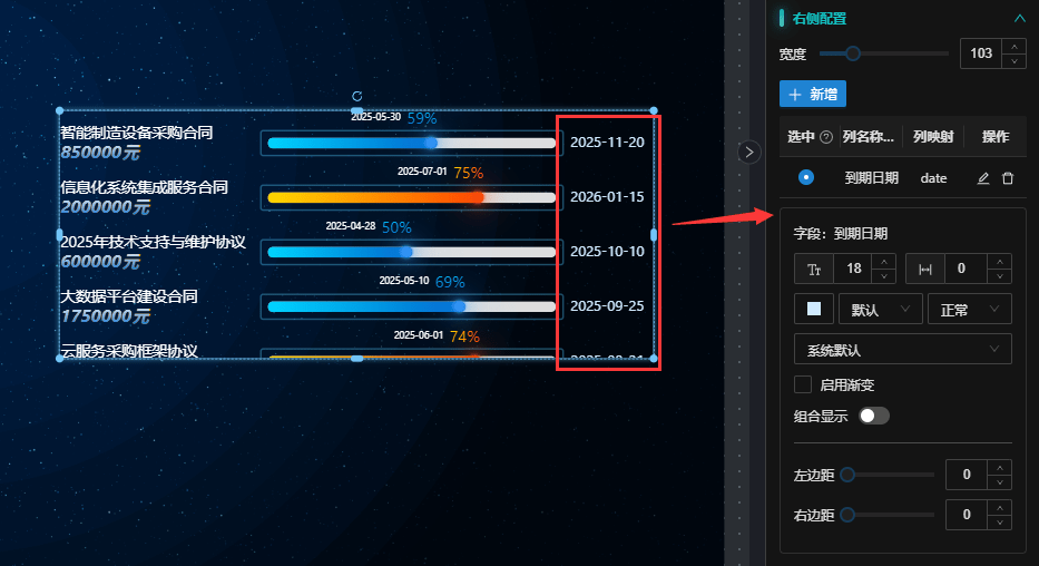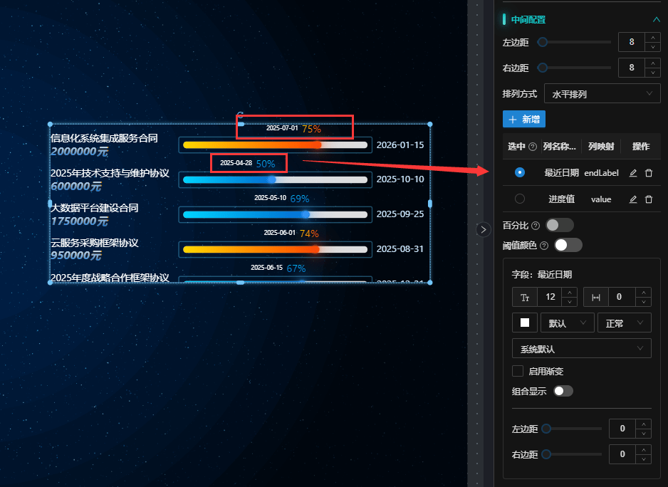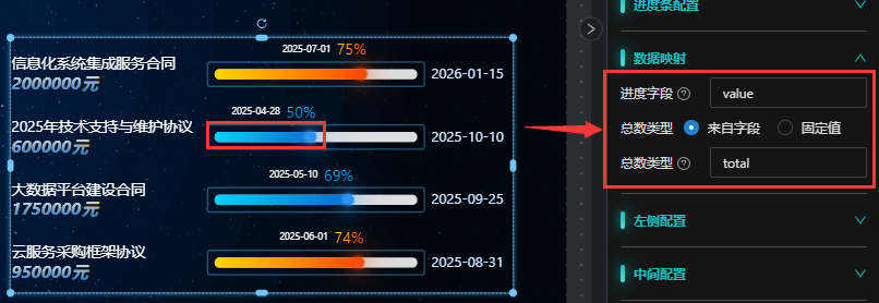 进度字段:映射数据源中的进度值字段,对应数据格式中的进度值字段
