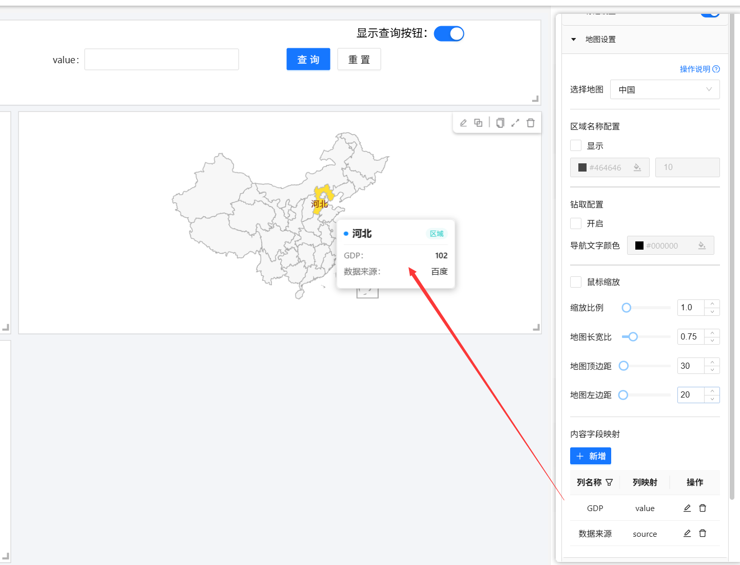 仪表盘设计器组件配置地图区域地图本页总览区域地图 区域地图展示地图样式,当鼠标移到地图上时,显示地域数据信息 1. 添加区域地图 点击地图选择区域地图,即可添加区域地图组件 2.数据配置 静态数据:查看专题 动态数据:查看专题 3.样式配置 3.1 通用样式配置:(查看专题) 3.2 地图配置:查看专题 4.交互配置 查看专题 5.效果展示 6.数据展示控制 区域地图默认显示配置字段原值。您可以通过配置地图设置中的内容字段映射属性,来精确控制 Tooltip 中展示的内容。 数据集配置:(数据集配置)