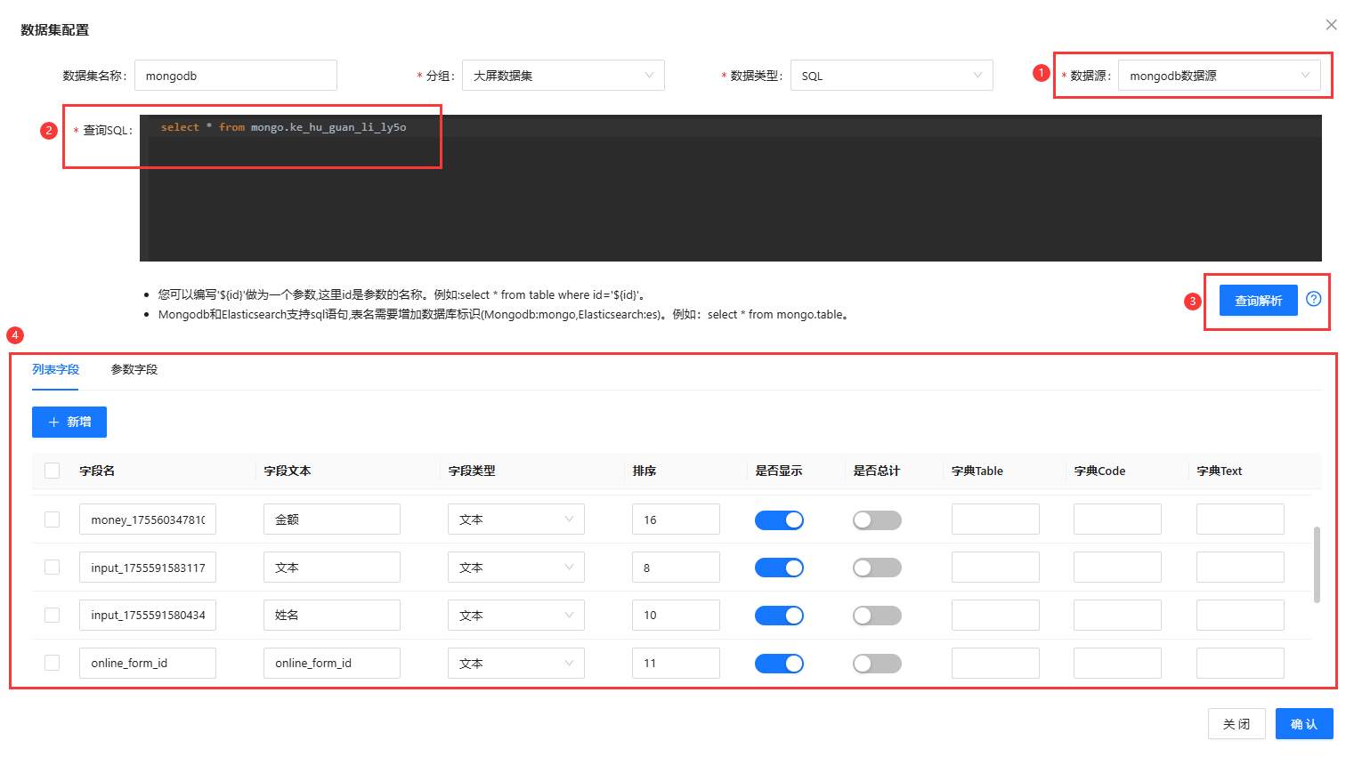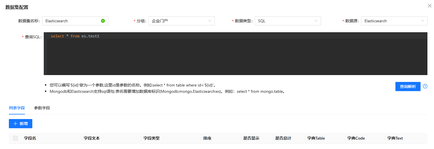 ③ 查询解析:点击查询解析,皆可将表中的字段解析到列表字段中
