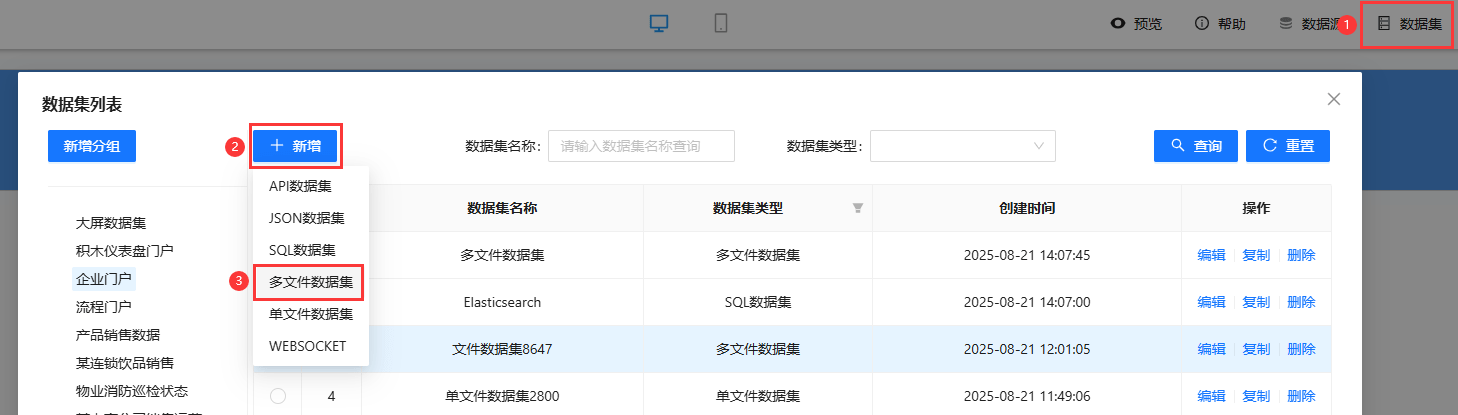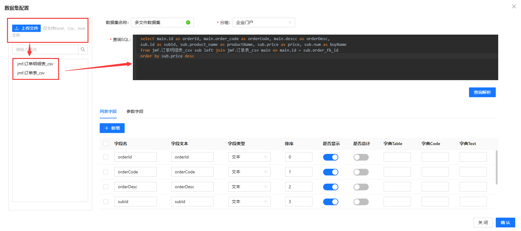 - 在添加数据集时,上传多个Excel、csv或json文件,使用mysql语法查询数据,并解析即可
