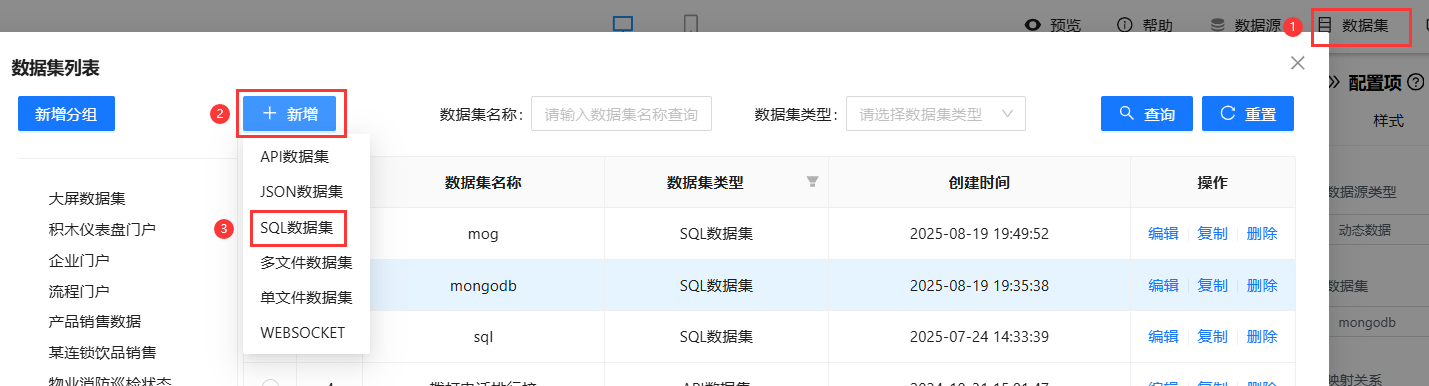 - 在数据集中新增SQL数据集,如下图: