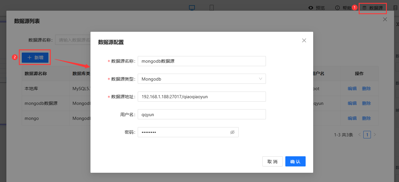 ① 选择数据源,如示例中选择新添加的“mongodb数据源”