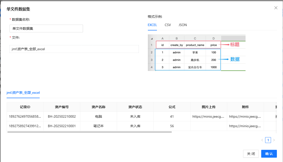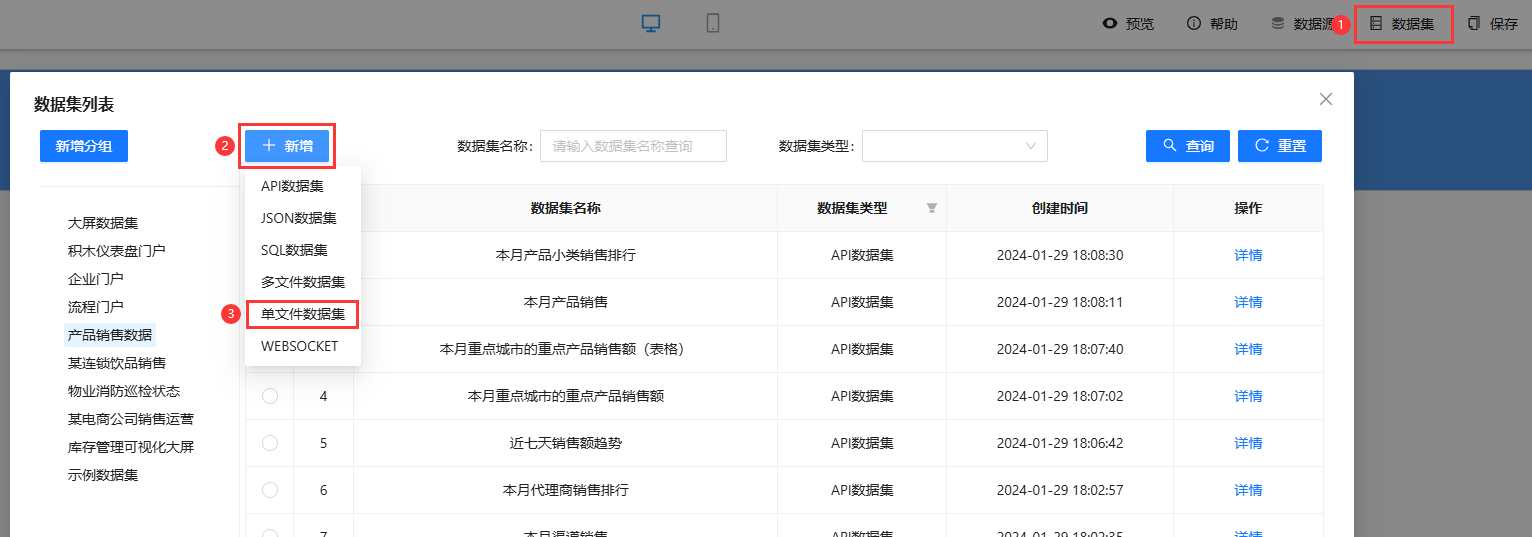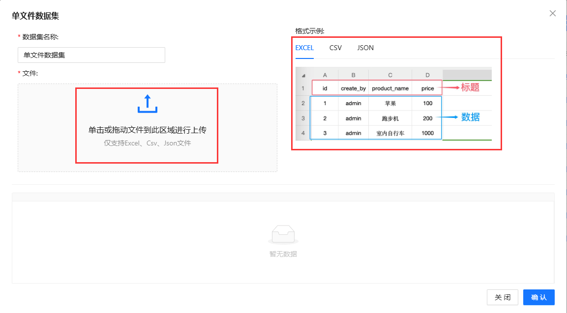文件数据集:上传本地单个或多个文件作为数据集,将数据展示为图表、表格等,文件类型为:excel、csv、json