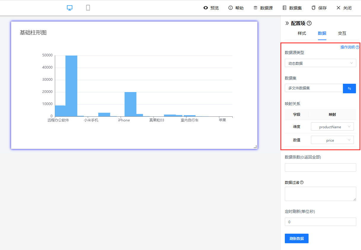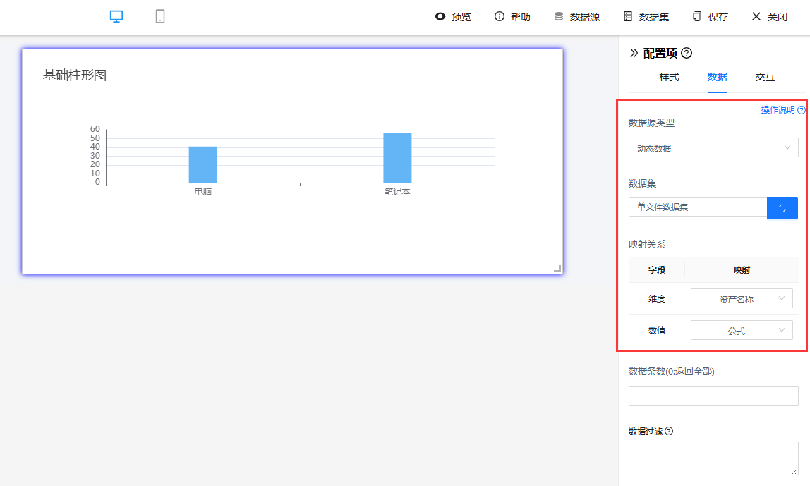 选择上一步添加的“单文件数据集”,配置字段映射关系,即配置好了图表