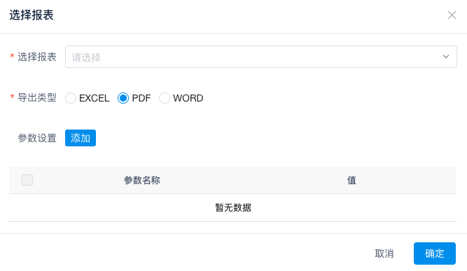 在新增报表弹窗中,可以选择报表、设置报表的导出类型并且设置报表参数。