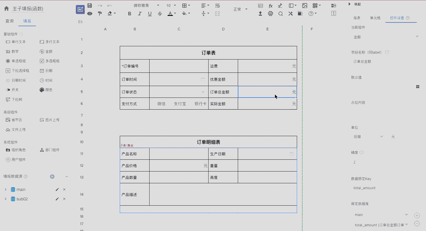 - 在设计页面,点击「订单总金额」组件