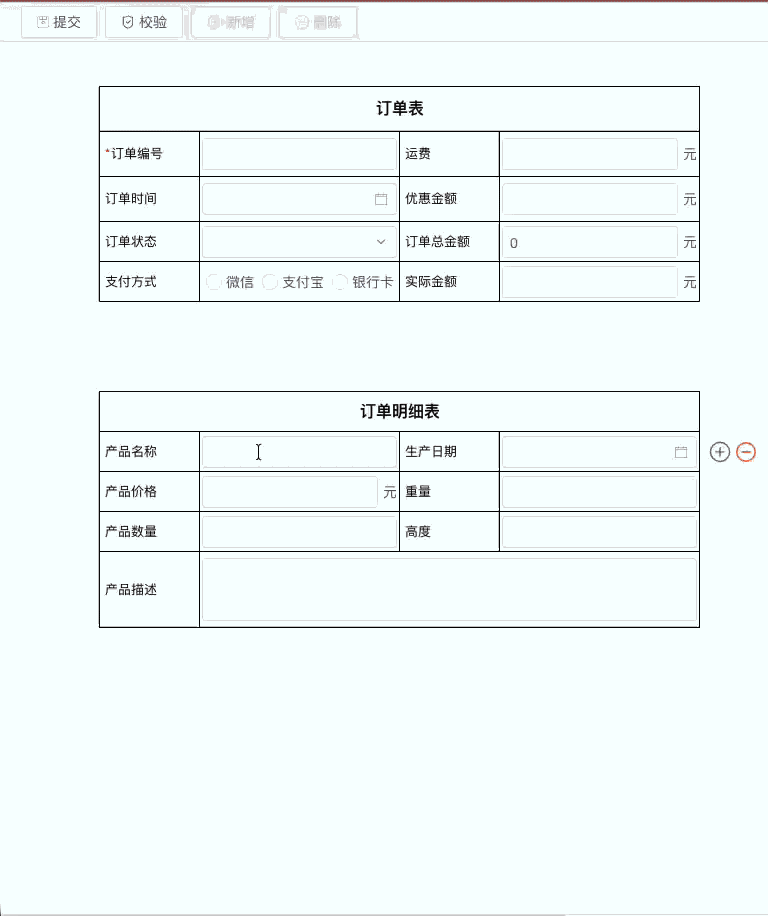 在预览页面,向子表添加数据,查看主表订单总金额是否正确汇总。